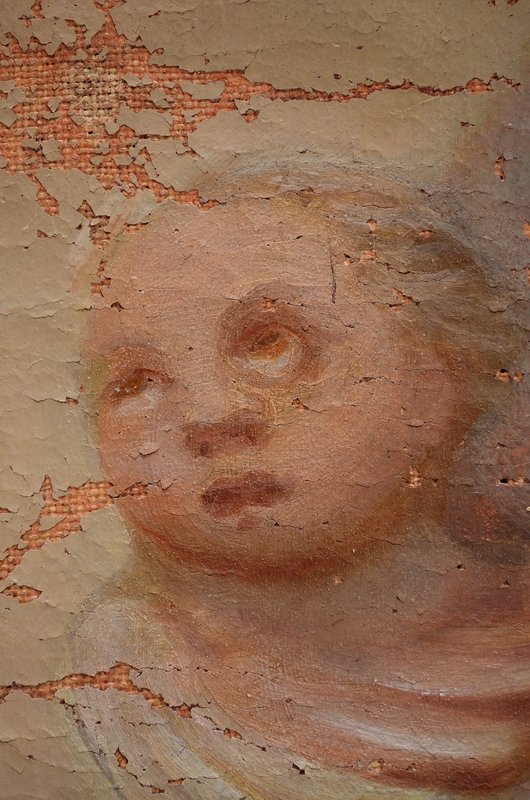 Olejomaľba bola pred reštaurovaním v havarijnom stave, ktorý svedčil o hrubom diletantskom nakladaní neznámej osoby tak pri samotnom odcudzení obrazu, ako aj pri ďalšej manipulácii s ním, pričom olejomaľbe nepomohlo ani jej stočenie maľbou smerom dovnútra. Chýbala celá spodná časť, ktorá bola pravdepodobne pri krádeži odtrhnutá alebo odrezaná. Plátno bolo čiastočne roztrhnuté v spodných partiách, maliarska vrstva bola v celej ploche poškodená uvoľnením od podkladu, skrakelovaná a na viacerých miestach opadaná. Iba očistená zadná strana plátna by mohla podľa reštaurátora naznačovať začatý a nedokončený pokus o reštaurovanie v čase, keď bol obraz odcudzený.