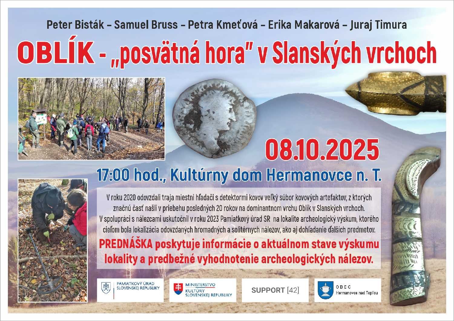 Ak sa chcete dozvedieť viac o jedinečných archeologických nálezoch z vrchu Oblík v Slanských vrchoch, príďte v stredu 8. 10. 2025 o 17.00 hod. na prednášku do kultúrneho domu v Hermanovciach. Odborníci budú hovoriť o aktuálnom stave archeologického výskumu jedinečnej lokality.