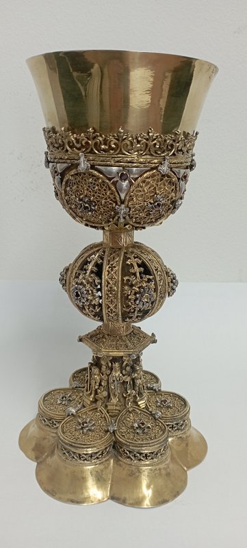 Konsekračný kalich bol, podľa nápisu na spodnej strane nohy, vyrobený v roku 1520. V roku 1627 ho renovovali. Šesťlupeňová základňa kalicha, noha s guľovitým nodusom a košík kupy sú zdobené technikami prerezávaného ornamentu, rytím, filigránom a striebornými rastlinnými ornamentmi, v ktorých sú umiestnené červené brúsené kamene. Na drieku nohy je šesť figurálnych plastík. Z figúr sa zatiaľ podarilo identifikovať postavu vzkrieseného Ježiša Krista, po jeho stranách sú dvaja svätci alebo svätice v starovekom oblečení, nasledujú dve postavy svätcov v rytierskom brnení a pandantom k postave Ježiša Krista je postava svätice s korunou na hlave, ktorá v ruke drží kríž alebo meč. Atribúty svätých nie sú dobre čitateľné, k ich interpretácii napomôže podrobný ikonografický rozbor.