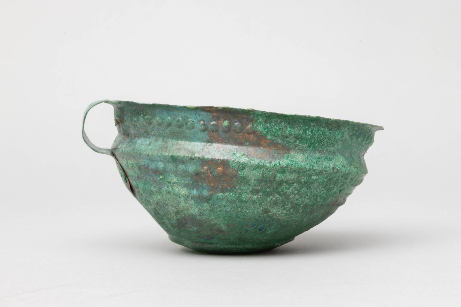 Ide o šálku vyhotovenú z bronzového plechu, zdobenú vytepávanou výzdobou, ktorá typologicky patrí k šálkam typu Jenišovice-Kirkendrup (obr. 1 – 5). Má výraznú profiláciu s vysoko položenou lomenou výduťou, ploché segmentované dno a lievikovite sa rozširujúce hrdlo s von vyhnutým okrajom. Výzdoba je v podobe radu väčších vypuklín na hrdle a striedajúcich sa radov menších (tzv. perličkovitých) a väčších vypuklín na tele. Nezdobené pásikové ucho je na koncoch rozšírené a k nádobe je pripevnené hore z vnútornej strany a dole z vonkajšej strany, a to dvoma nitmi hore aj dole.